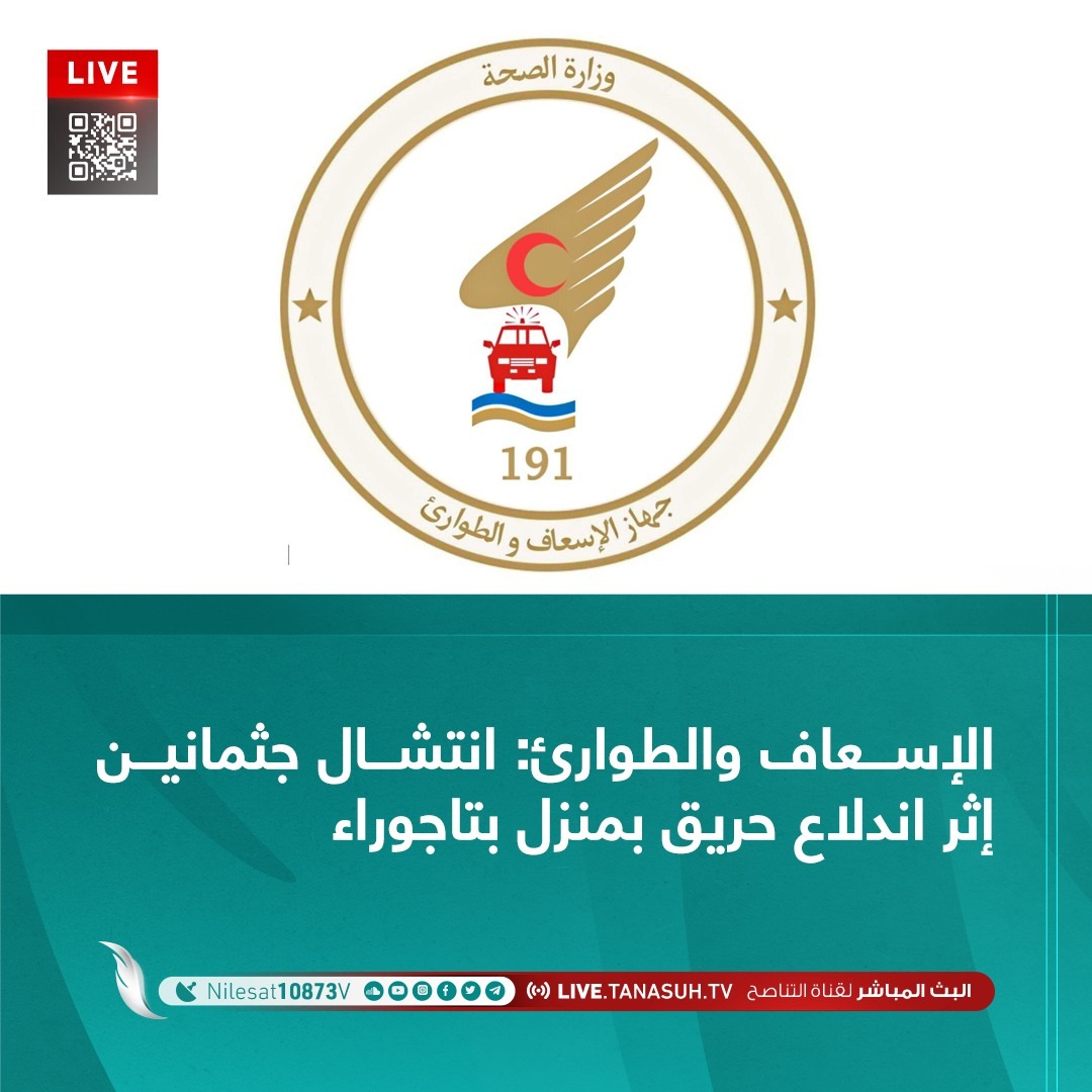 جهاز الإسعاف والطوارئ يعلن انتشال جثمانين من منزل عائلة غومة بالقرب من جزيرة القمودي تاجوراء بسبب اندلاع حريق بالمنزل، ونقلت الحالتان إلى مستشفى الحروق بطرابلس