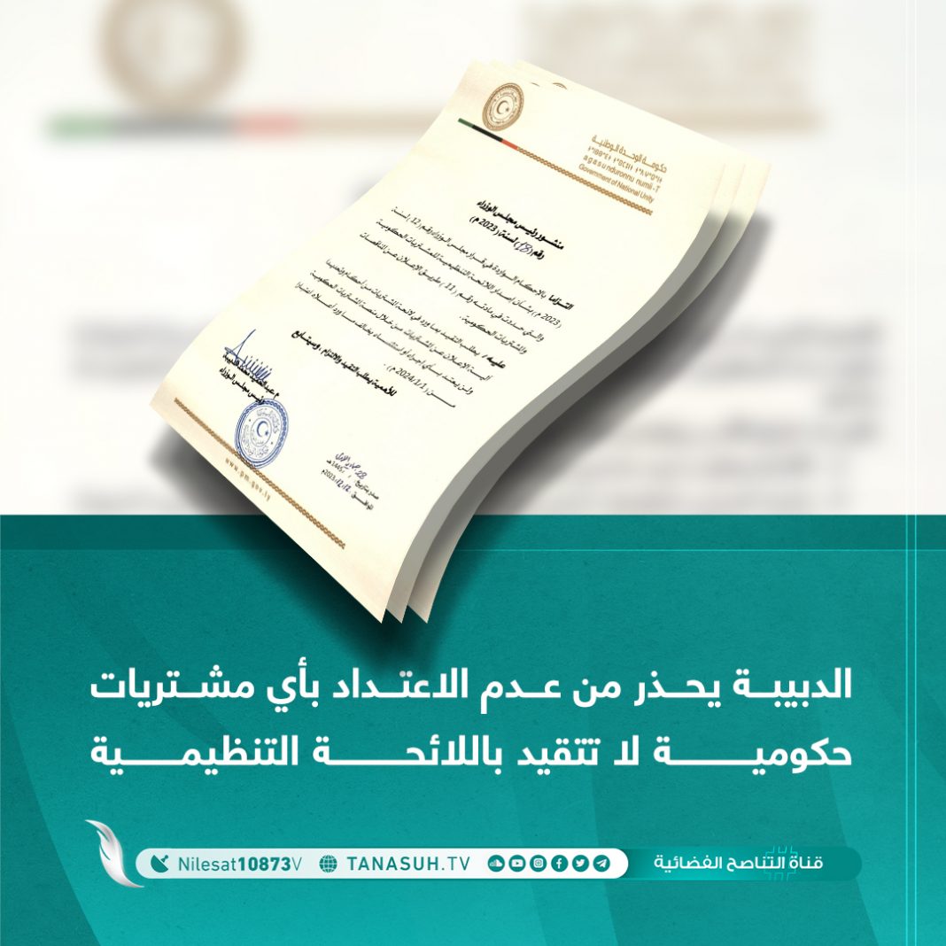 شدد رئيس الحكومة عبد الحميد دبيبة، في منشور له، على ضرورة التقيد بما ورد في اللائحة التنظيمية للمشتريات الحكومية من أحكام، وإعلان المشتريات من خلال منصة المشتريات الحكومية ابتداء من مطلع العام المقبل