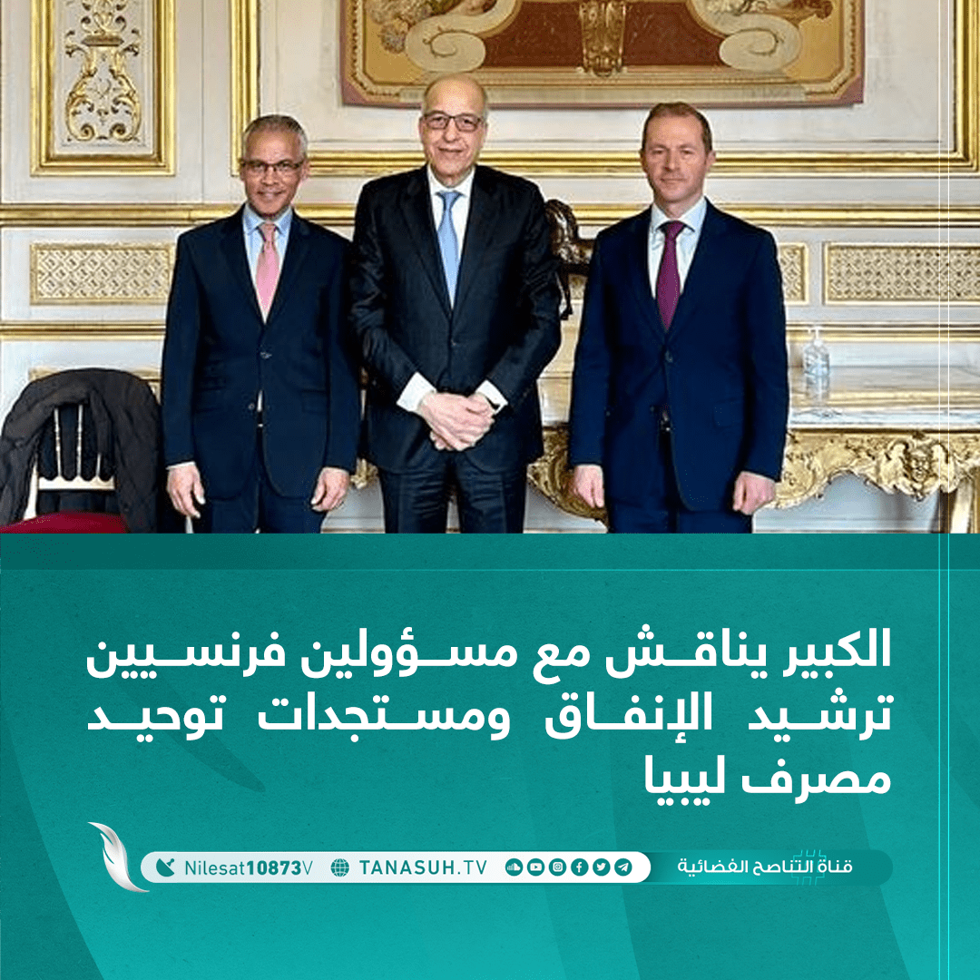 بحث محافظ مصرف ليبيا المركزي الصديق الكبير مع المبعوث الخاص الفرنسي إلى ليبيا بول سولير والسفير الفرنسي مصطفى مهراج في العاصمة الفرنسية باريس الجمعة ترشيد الإنفاق ومستجدات توحيد مصرف ليبيا المركزي والجهود المبذولة لإقرار ميزانية موحدة لسنة 2024 بالتعاون مع الأطراف ذات العلاقة.