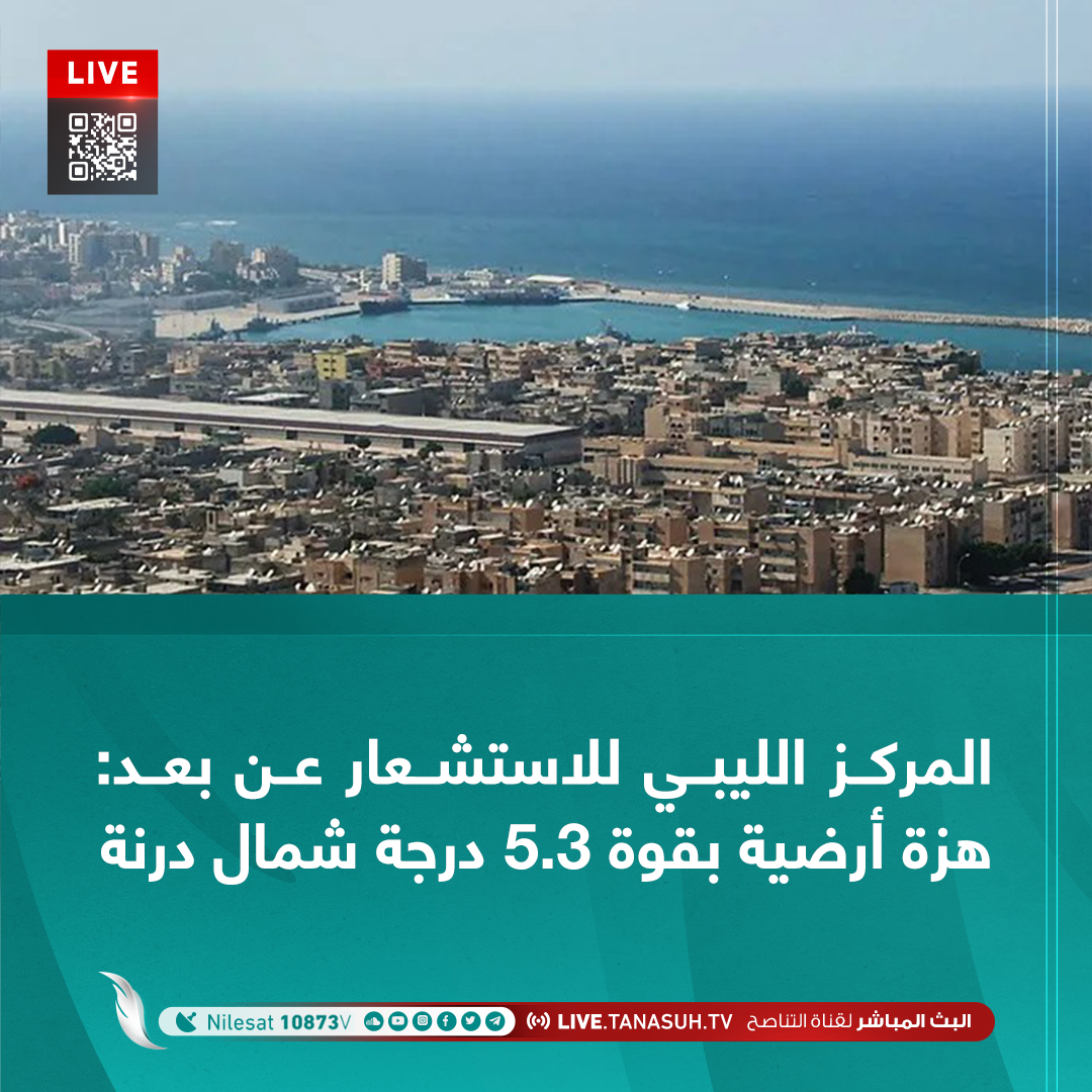 المركز الليبي للاستشعار عن بعد وعلوم الفضاء يؤكد حدوث هزة أرضية قرابة السواحل ليبيا ،صباح الأحد بقوة 5.3 درجة على مقياس ريختر على بعد 250 كلم شمال مدينة درنة.