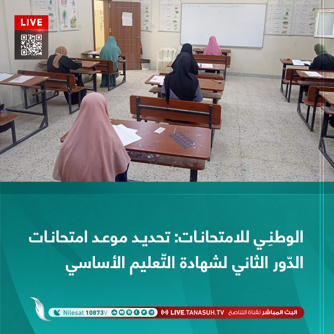 أعلن المركز الوطنِي للامتحانات أن اِمتحانات الدّور الثاني لتلامِيذ شهادة إتمام مرحلة التّعليم الأساسي للعام الدّراسي 2023 – 2024م، ستنطلق يوم الثلاثاء 23 من الشهر الجاري.