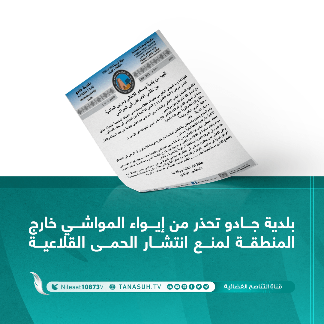 حذرت بلدية جادو في بيان لها الجمعة من تفشي الأمراض في المواشي، داعية المربين إلى عدم تسهيل إيواء المواشي سواء بأعداد صغيرة أو قطعان من الأهالي أو المربين الذين هم خارج البلدية لمنع انتشار عدوى الحمى القلاعية.