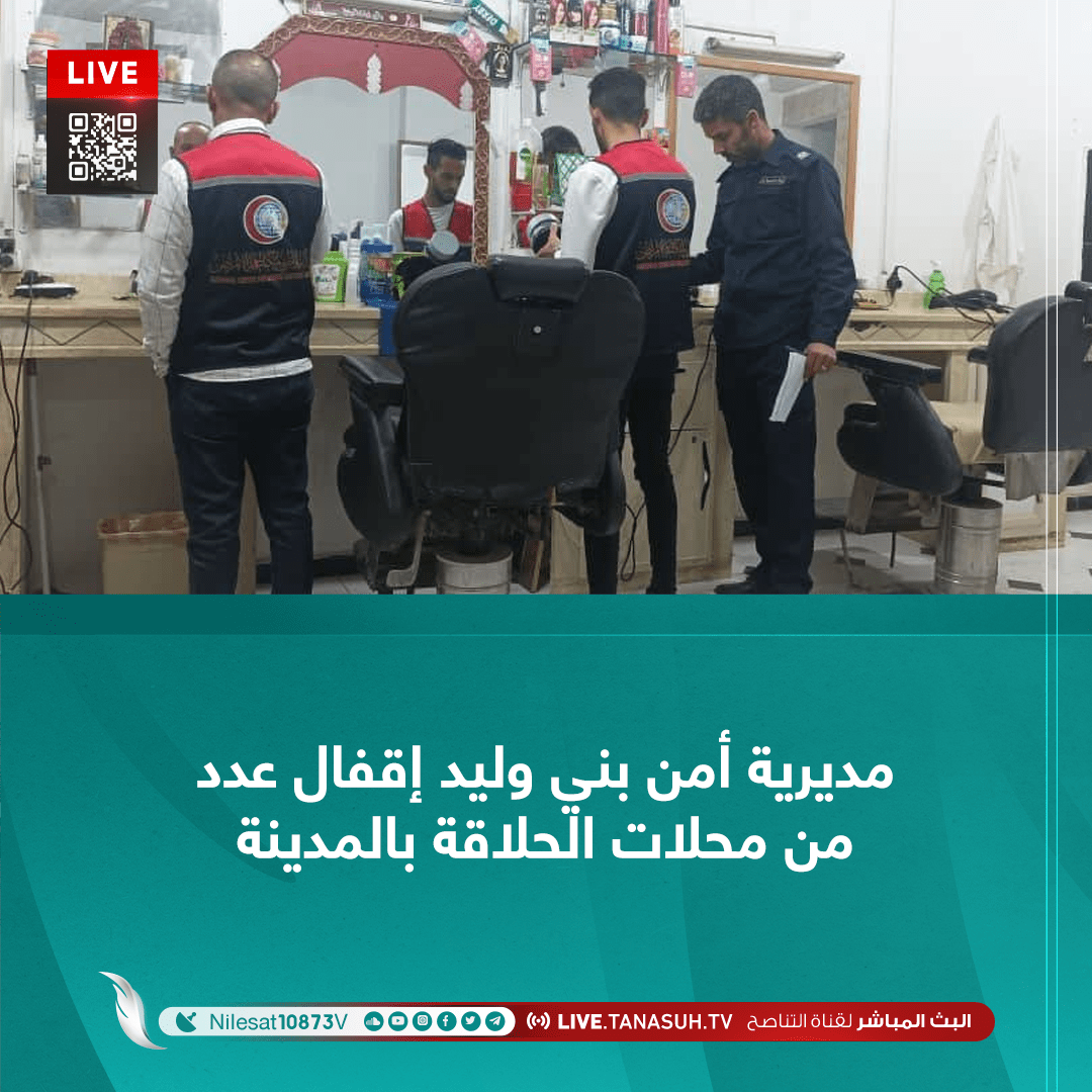 أعلنت مديرية أمن بني وليد إقفال عدد من محلات الحلاقة بالمدينة لمخالفتها الضوابط والاشتراطات القانونية، جاء ذلك خلال جولات تفتيشية لفئة الحلاقين بالتعاون مع الحرس البلدي و مركز مكافحة الأمراض ومكتب الرعاية الصحية و مركز الرقابة على الأغدية، مشيرة إلى أنها اتخدت الإجراءات القانونية حيالها .