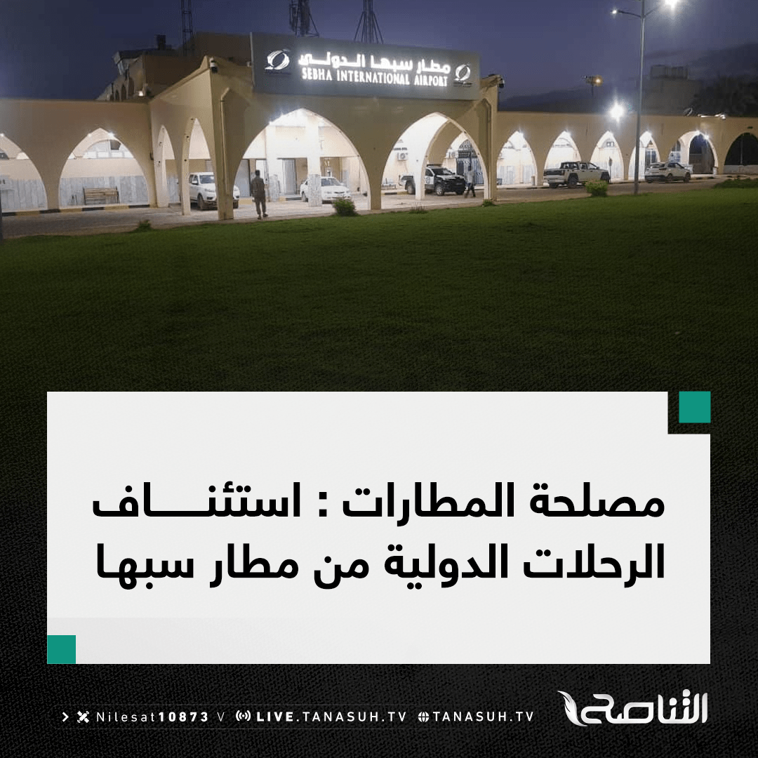 مصلحة المطارات تعلن استئناف الرحلات الجوية في مطار سبها بعد توقف بسبب التقلبات الجوية، وسيتم تسيير رحلتين من الإسكندرية إلى سبها، ومن سبها إلى بنينا اليوم