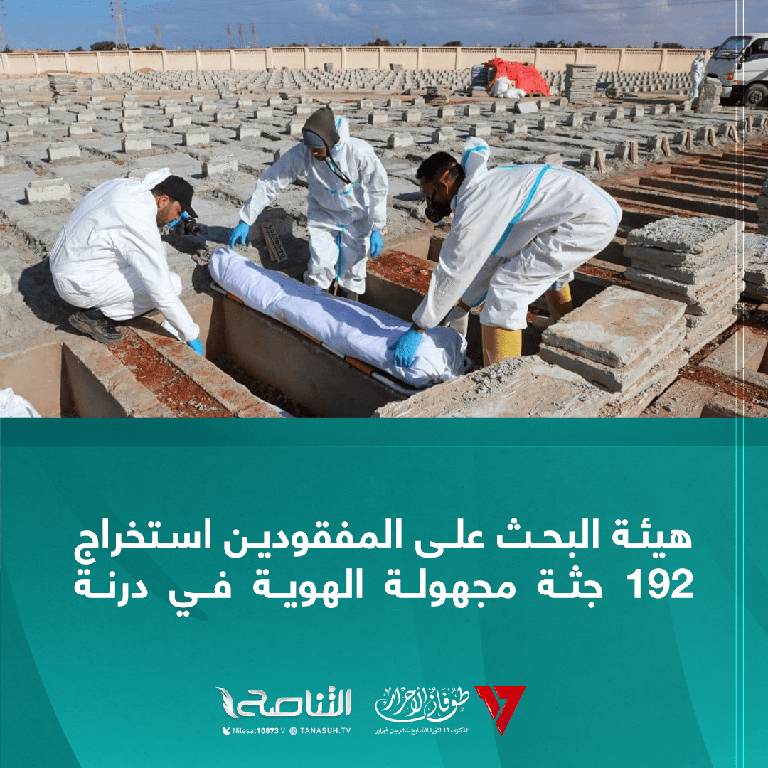 أعلنت الهيئة العامة للبحث والتعرف على المفقودين، اليوم الثلاثاء استخراج 192 جثة مجهولة الهوية من مقبرة مرتوبة بمدينة درنة، وأخذت الفرق المختصة بالهيئة 420 عينة من الجثث المستخرجة للتعرف على هويات أصحابها