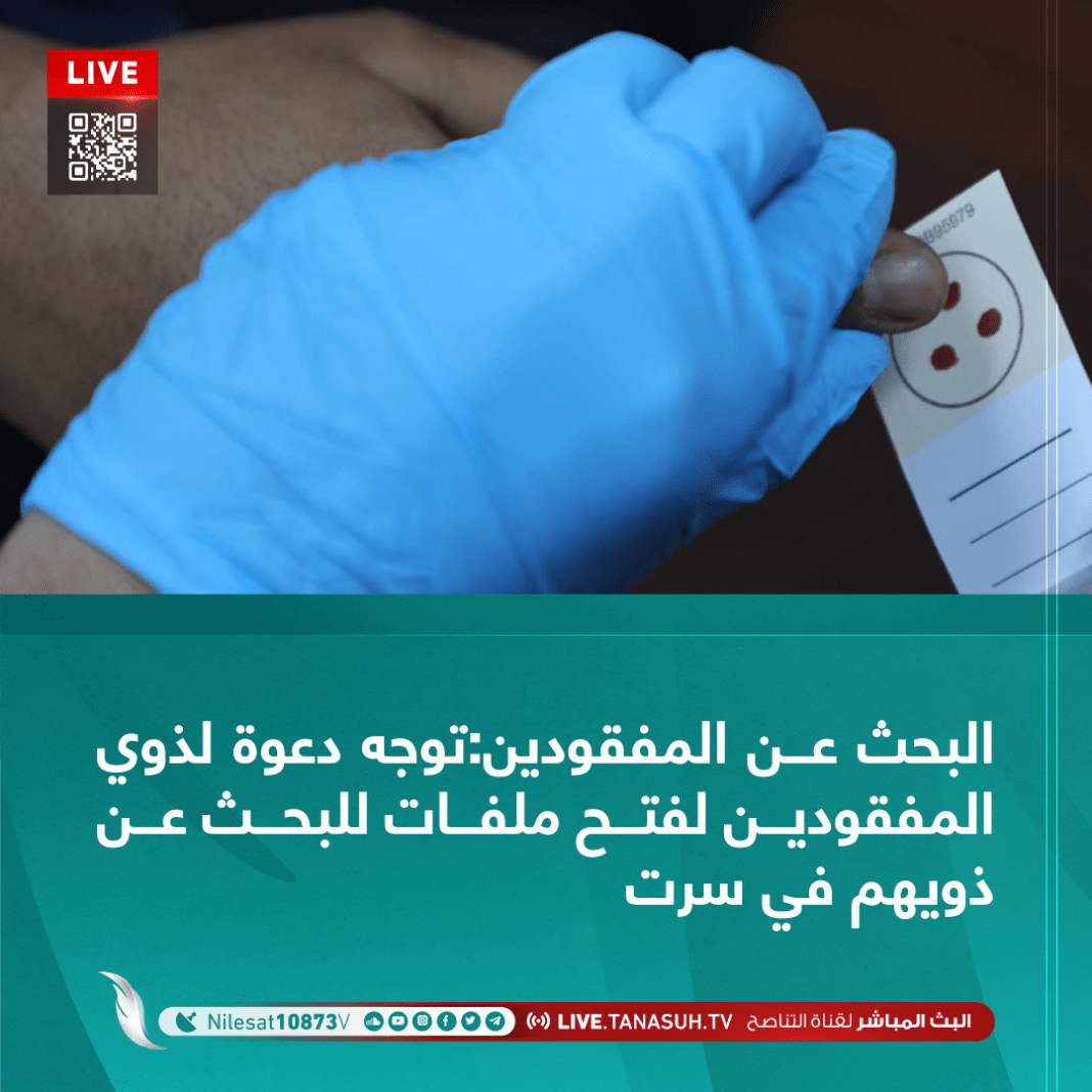 طالبت الهيئة العامة للبحث والتعرف على المفقودين جميع الأسر التي لديها مفقود في مدينة سرت، التواصل مع فريق الهيئة الموجود بالمدينة، وفتح ملفات أخذ العينات المرجعية.