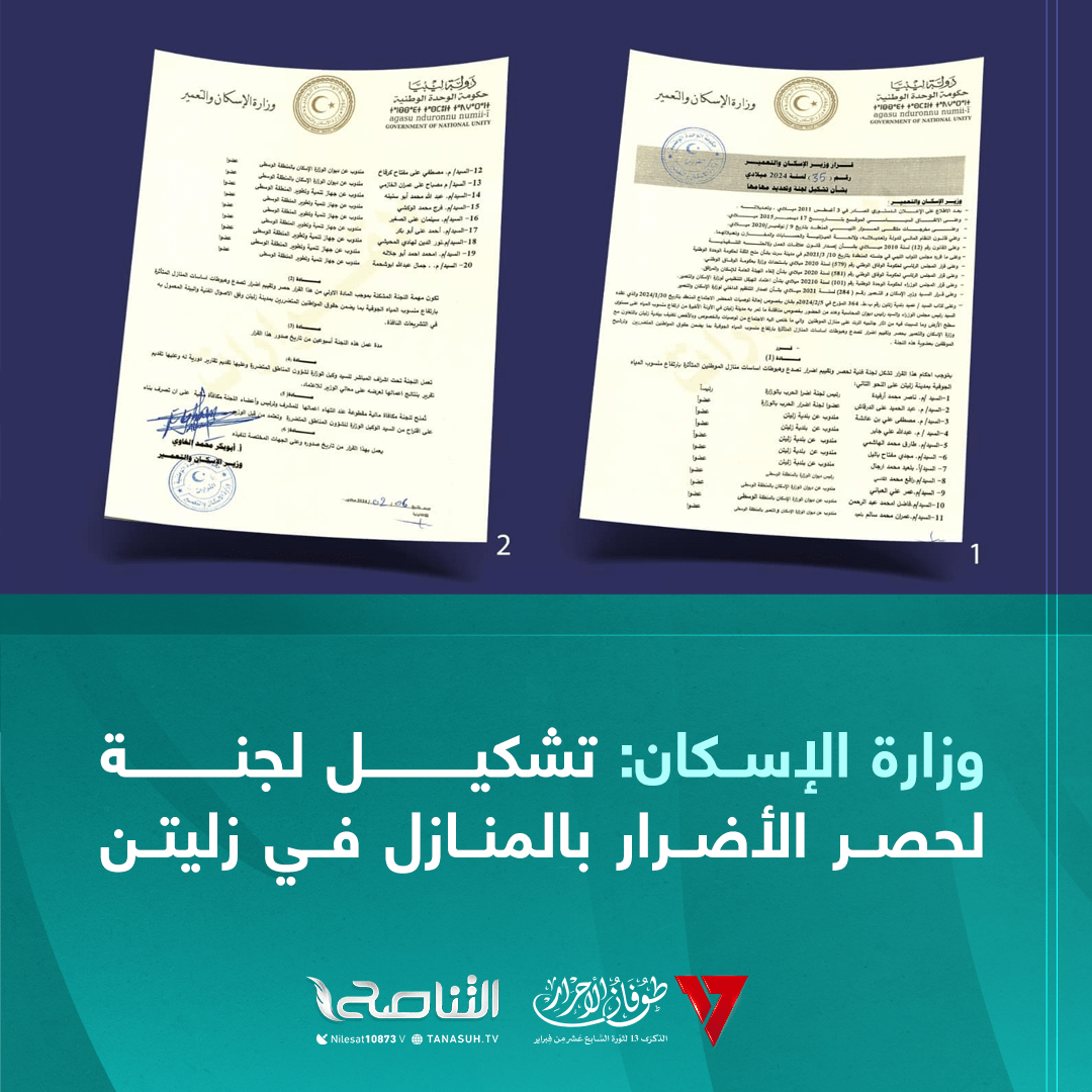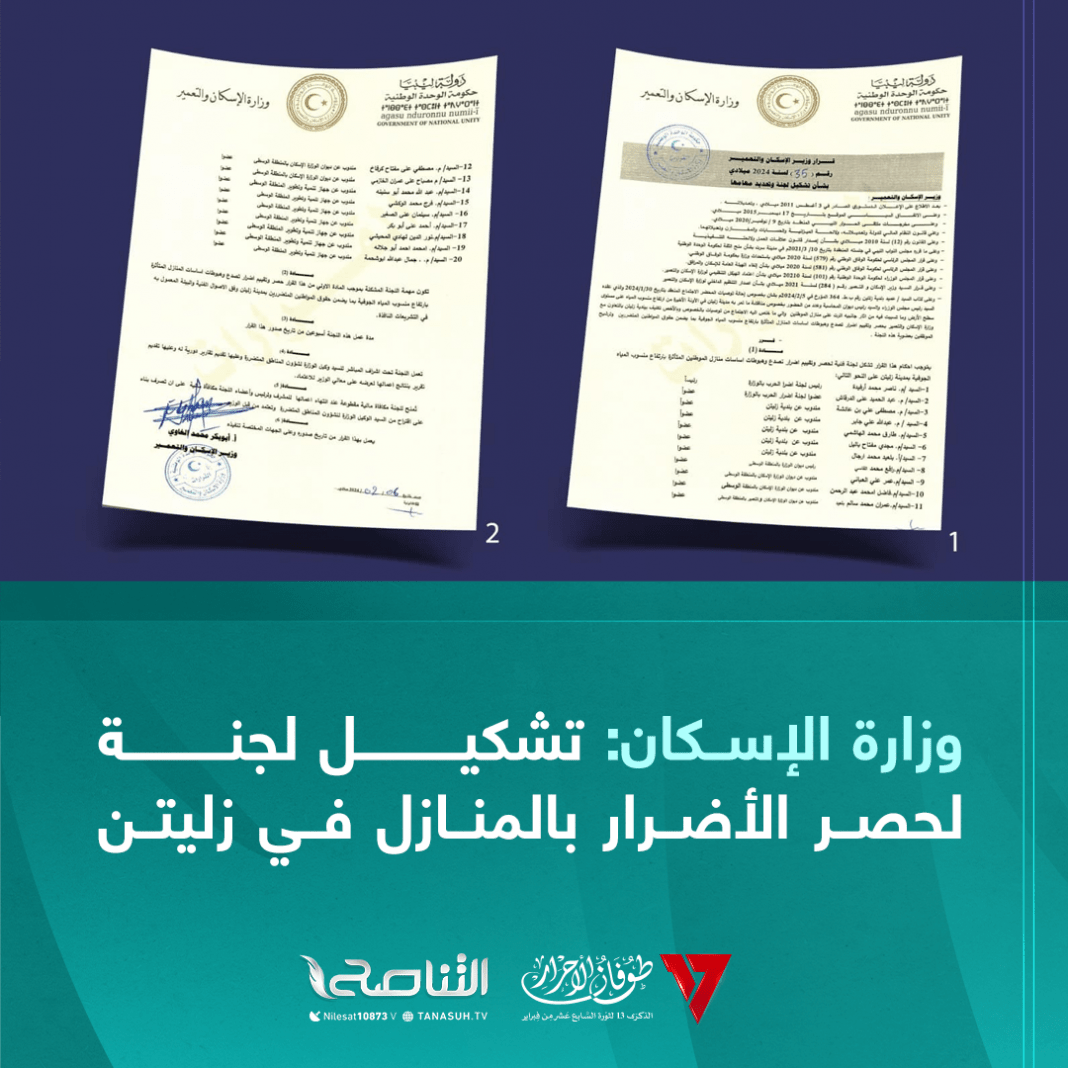 أصدر وزير الإسكان والتعمير أبو بكر الغاوي قرارًا بتشكيل لجنة فنية مهمتها حصر وتقييم منازل المواطنين المتأثرة بارتفاع منسوب المياه في زليتن