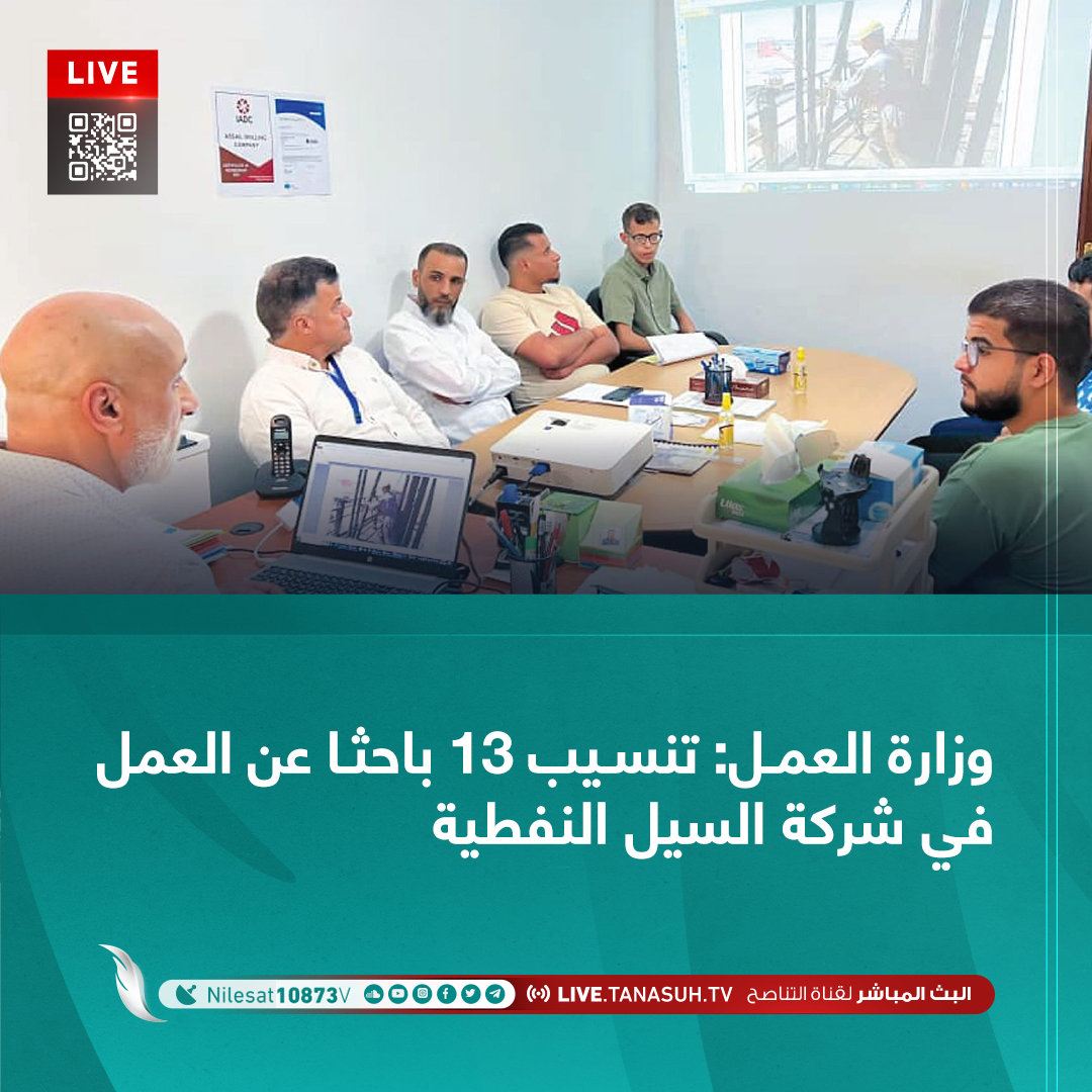 أعلنت وزارة العمل تنسيب 13 باحثا عن العمل في شركة السيل للحفر وصيانة الآبار النفطية، وذلك في إطار تفعيل اتفاقيات التشغيل المبرمة بين الوزارة والشركات.