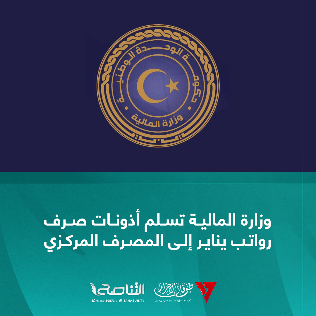 سلمت وزارة المالية الثلاثاء، أذونات صرف رواتب يناير الماضي لجميع الجهات الممولة من الخزانة العامة للدولة إلى إدارة العمليات المصرفية بمصرف ليبيا المركزي