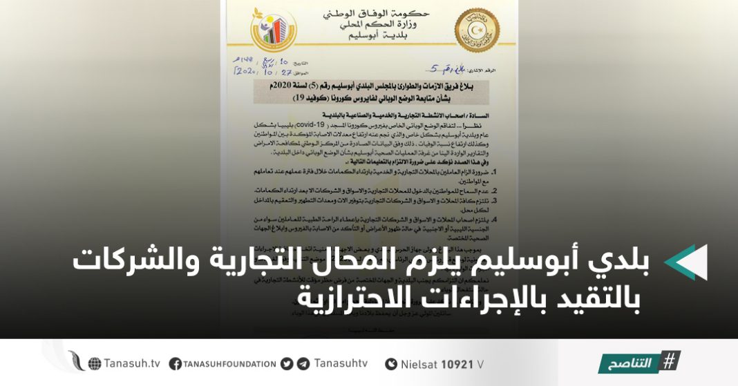 شددت بلدية أبو سليم على ضرورة التزام المحلات التجارية والخدمية بالتقيد بالإجراءات الاحترازية من ارتداء الكمامات وتوفير معدات التطهير والتعقيم بها بعد تزايد الحالات المصابة مؤخرا بفيروس كورونا بالبلدية