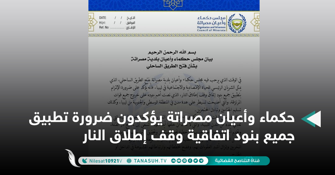 رحب مجلس حكماء وأعيان بلدية مصراتة في بيان أمس السبت بفتح الطريق الساحلي الرابط بين مصراتة وسرت الذي أعلنت لجنة 5+5 فتحه في 30 يوليو الماضي