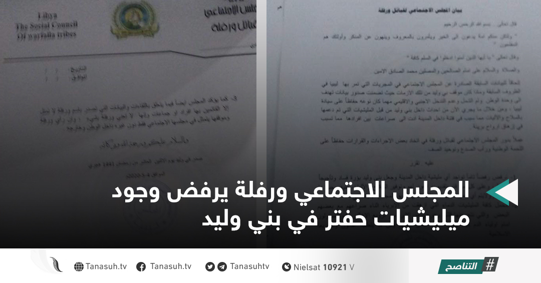 أعلن المجلس الاجتماعي لقبائل ورفلة رفضه وجود ميليشيات حفتر داخل مدينة بني وليد.
