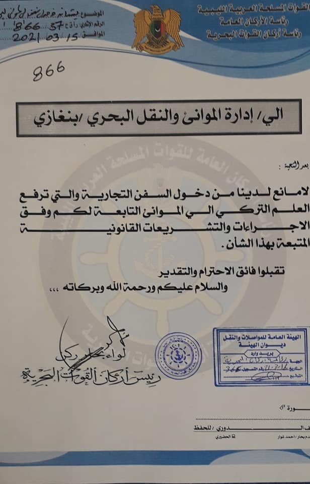 جاء ذلك في خطاب من مدير الإدارة حسين الشرع إلى رؤساء مصلحة المواني والنقل البحري ومجلس إدارة الشركة الليبية للمواني وغرفة الملاحة الليبية في المنطقة الشرقية يشار إلى أنّ ميليشيات حفتر أوقفت في ديسمبر الماضي سفينة تركية تجارية في المياه الإقليمية لليبيا كانت متجهة إلى المنطقة الغربية