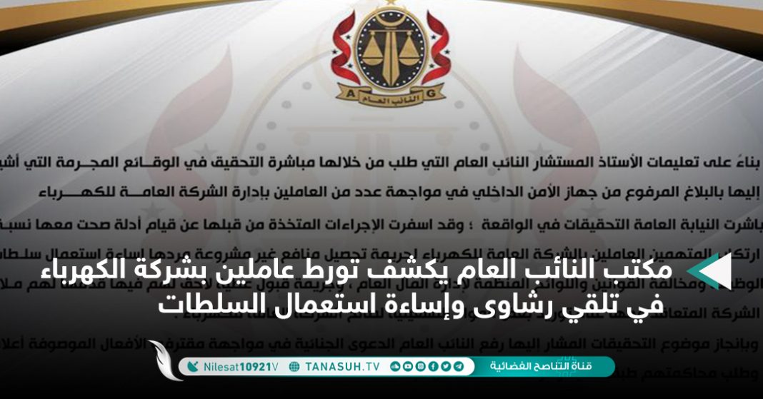 أعلن مكتب النائب العام وجود أدلة تثبت تورط عدد من موظفي شركة الكهرباء بإساءة استعمال سلطات الوظيفة لتحصيل منافع غير مشروعة وقبول الرشاوى ومخالفة اللوائح المنظمة لإدارة المال العام