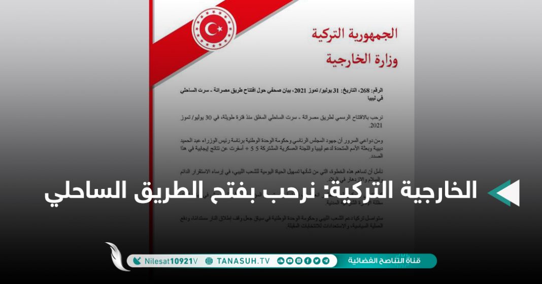 رحبت وزارة الخارجية بالجمهورية التركية بفتح الطريق الساحلي الرابط بين الشرق والغرب مشيرة إلى أنها تأمل أن تسهم هذه الخطوة في تسهيل الحياة اليومية للشعب الليبي