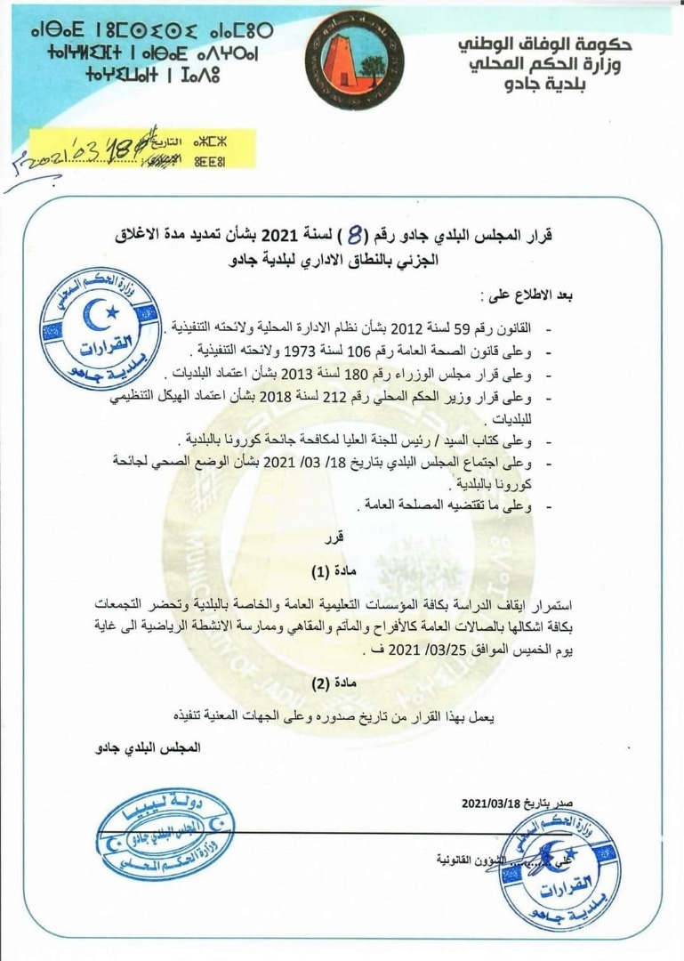 أصدرت بلدية جادو قرارا يقضي بإيقاف الدراسة بكافة المؤسسات التعليمية العامة والخاصة بالبلدية وحظر كافة التجمعات بكافة أشكالها