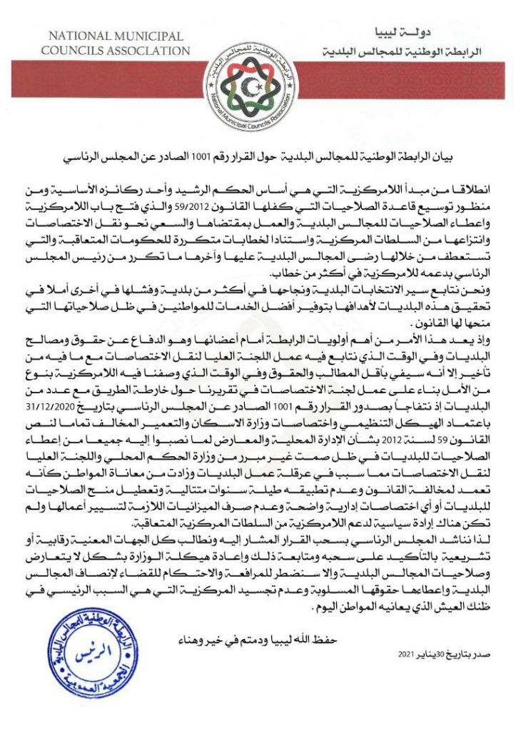 وأوضح البيان أن القرار الأخير زاد من معاناة المواطن وعرقل عمل البلديات متهما الرئاسي بعدم تطبيق القانون طيلة سنوات متتالية وتعطيل منح الصلاحيات للبلديات أو أي اختصاصات إدارية في ظل صمت غير مبرر من قبل وزارة الحكم المحلي واللجنة العليا لنقل الاختصاصات مؤكدين أنه في حالة عدم سحب القرار ستضطر الرابطة لرفع القضية إلى القضاء الليبي