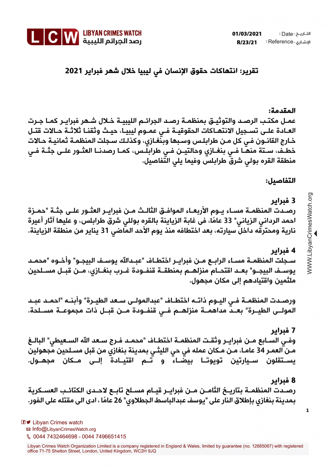 وثقت منظمة رصد الجرائم الليبية خلال شهر فبراير ثلاث حالات قتل خارج القانون في كل من طرابلس وسبها وبنغازي، وكذلك سجلت المنظمة ثماني حالات خطف، ستة منها في بنغازي وحالتان في طرابلس.