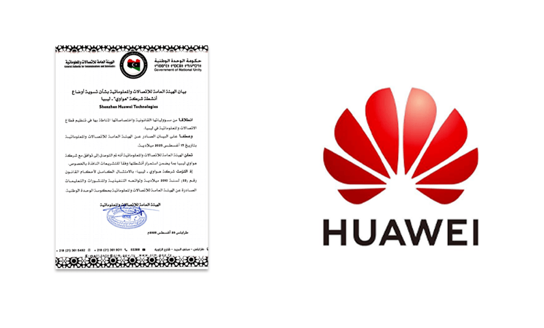 أعلنت الهيئة العامة للاتصالات والمعلوماتية عن توصلها إلى توافق مع شركة هواوي ليبيا يضمن استمرار أنشطتها داخل البلاد وفق التشريعات النافذة.