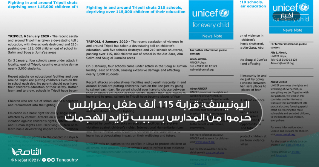ذكرت وكالة اليونيسسيف أنّ الهجمات الأخيرة على العاصمة طرابلس أدّت إلى تدمير خمس مدارس وإغلاق 210 مدارس ممّا أدى إلى حرمان قرابة 115 ألف طفل من حقّهم التعليمي