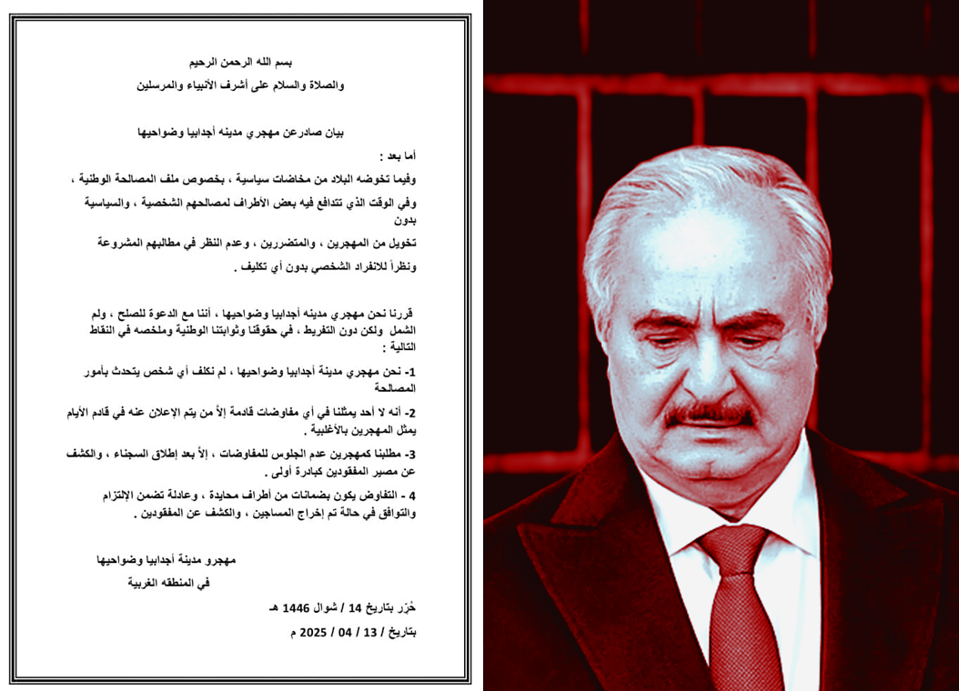 قال مهجرو مدينة اجدابيا وضواحيها إن مطالبهم قبل الجلوس في مفاوضات المصالحة مع معسكر الرجمة هو إطلاق سراح السجناء والكشف عن مصير المفقودين