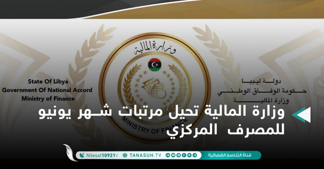 أعلنت وزارة المالية بحكومة الوحدة الوطنية اليوم الاثنين تسليم أذونات الصرف الخاصة بمرتبات شهر يونيو لكافة الجهات الممولة من الخزانة العامة إلى مصرف ليبيا المركزي