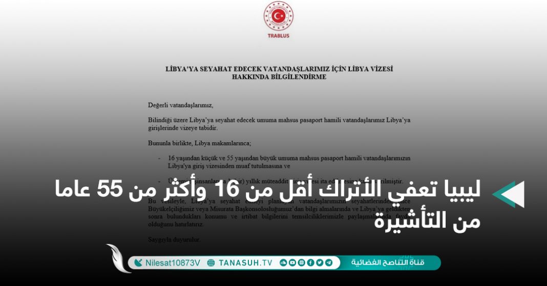 أعفت السلطات الليبية المواطنين الأتراك الذين تقل أعمارهم عن 16 عاماً وأكثر من 55 عاماً، من حاملي جوازات سفر عادية، من الحصول على تأشيرة الدخول إلى ليبيا