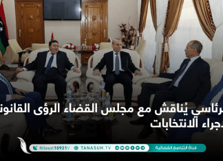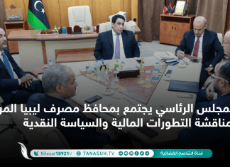 النائبان بالمجلس الرئاسي عبد الله اللافي وموسى الكوني، ورئيس الحكومة عبد الحميد الدبيبة، ورئيس ديوان المحاسبة، ومحافظ مصرف ليبيا المركزي، يبحثون خلال اجتماعهم اليوم...